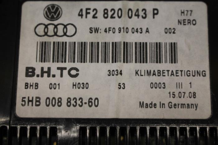 Climatronic paneel / weergave-en bedieningseenheid voor elektron. geregelde airconditioning ENGELS (rechtgestuurde wagen) Kleur: Nero (zwart) Kleurcode: H77 Fabrikant: OE Vergelijkingsnummer: 4F2820043P H77