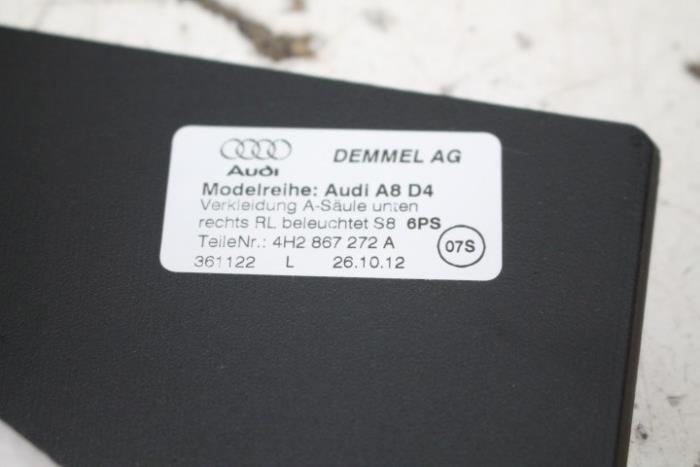 A-stijlbekleding rechts onder ENGELS (rechtsgestuurde wagen) Kleur: Soul (zwart) Kleurcode: 6PS Fabrikant: OE LET OP!!! HEEFT WAT GEBRUIKSSPOREN!!! Vergelijkingsnummer: 4H2867272A 6PS